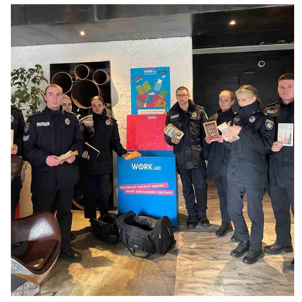 Курсанти Дніпропетровського державного університету внутрішніх справ взяли участь у благодійній ініціативі зі збору та переробки російськомовної літератури на користь Збройних Сил України. Організував акцію місцевий активіст Павло, який закликав дніпрян звільнити домашні полиці від творів країни-агресорки. Ідею підтримали майбутні правоохоронці: несли не лише російськомовні книжки, а й книжки росі...